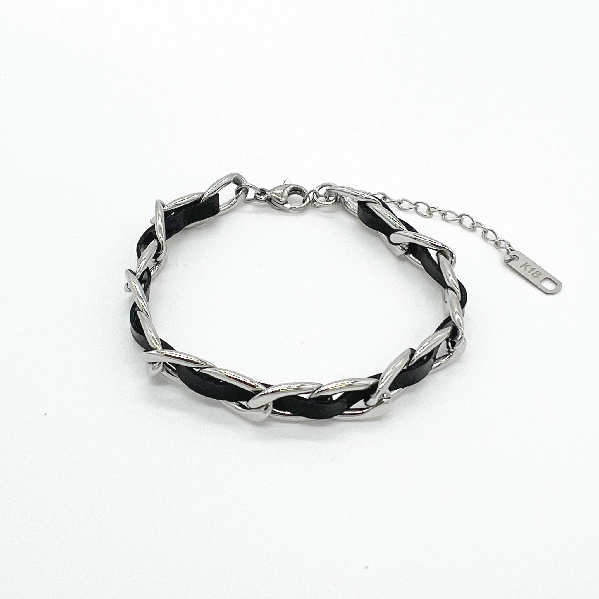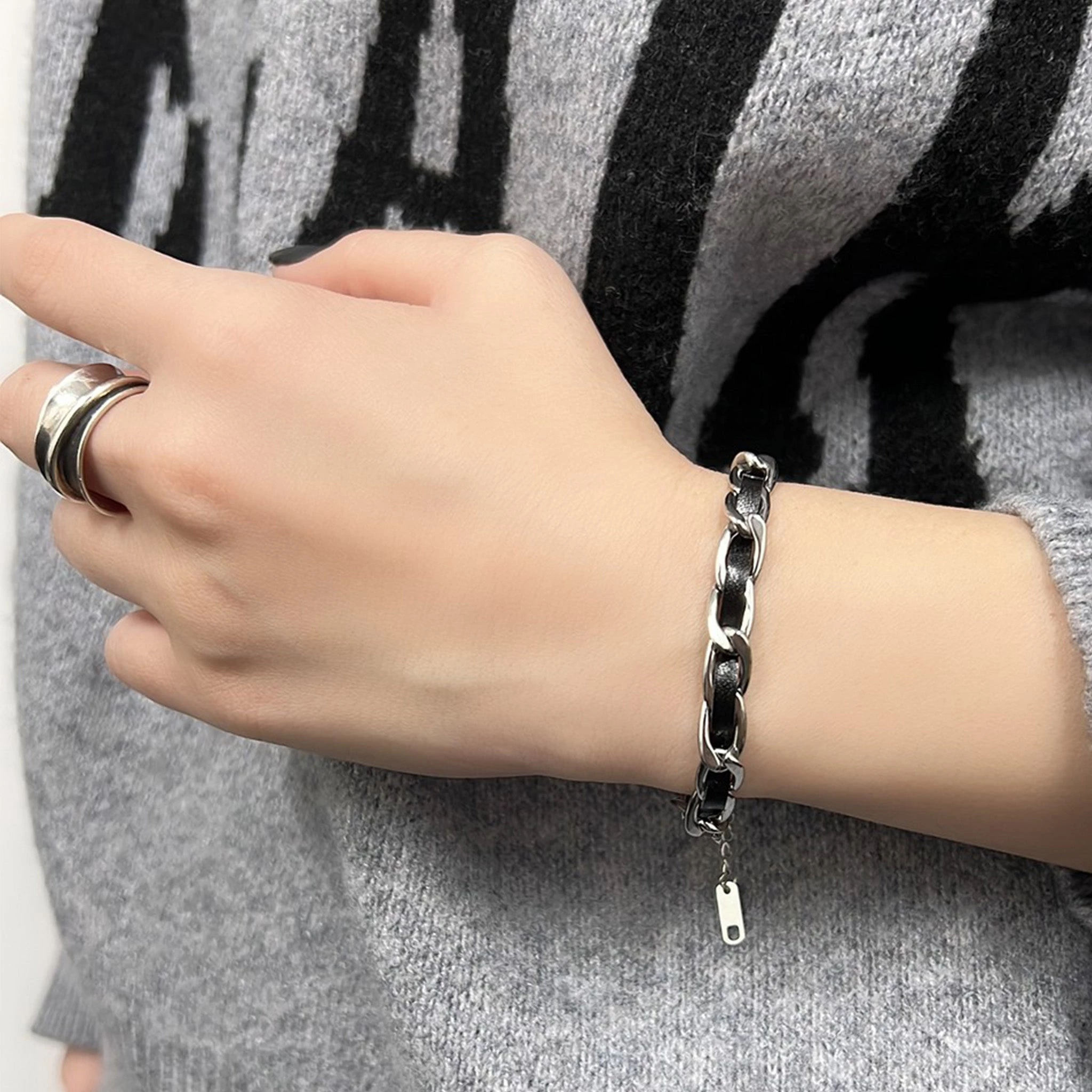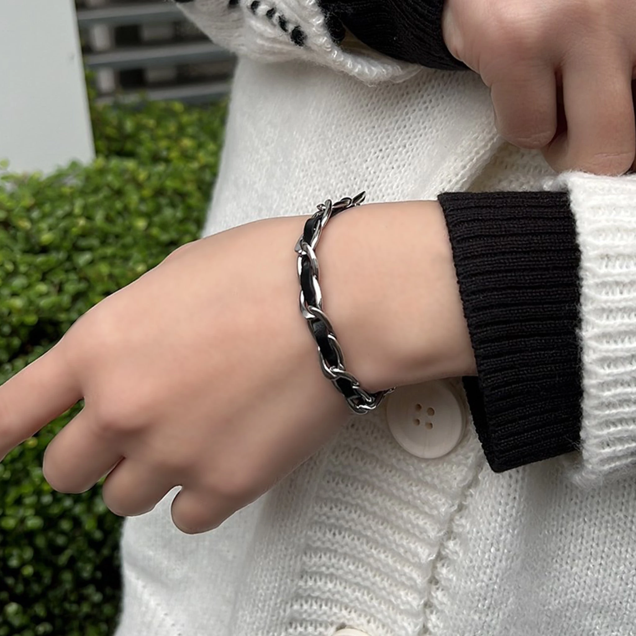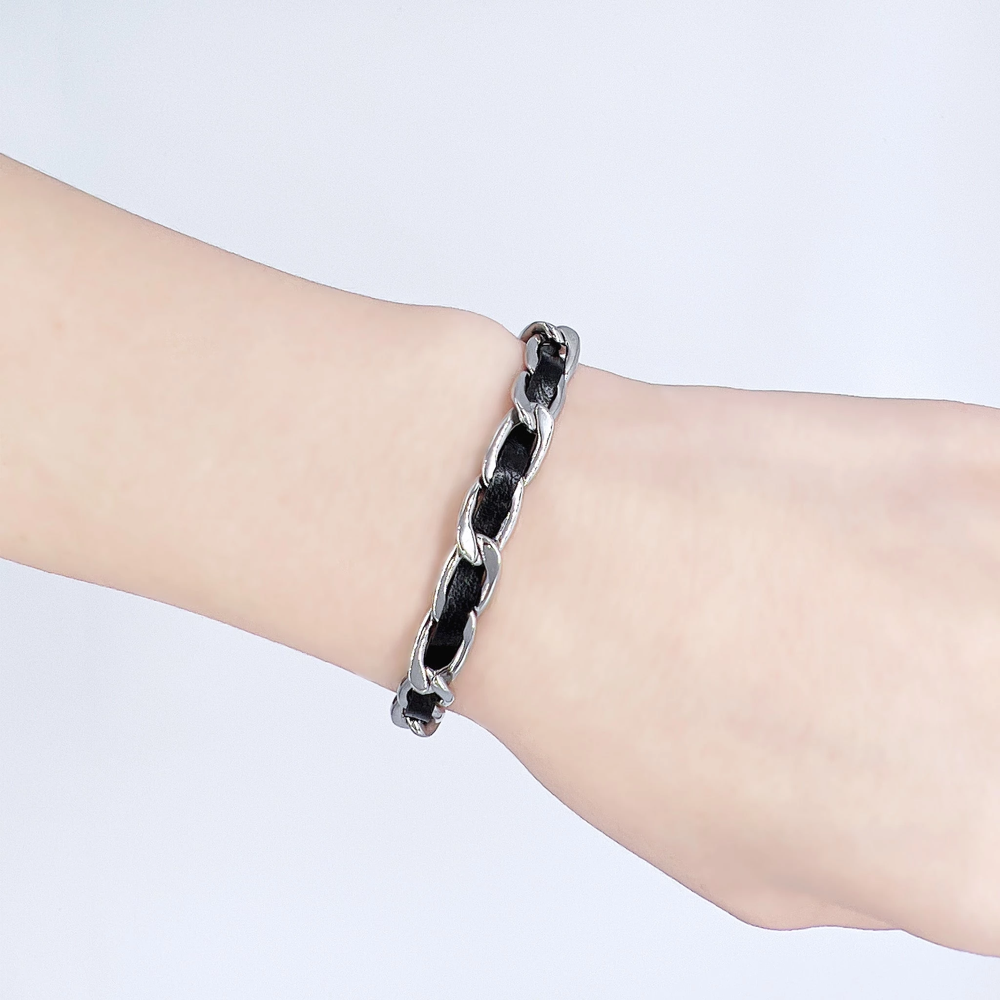 レザー×チェーンでクールな印象を与える「フェイクレザーチェーンブレスレット」。