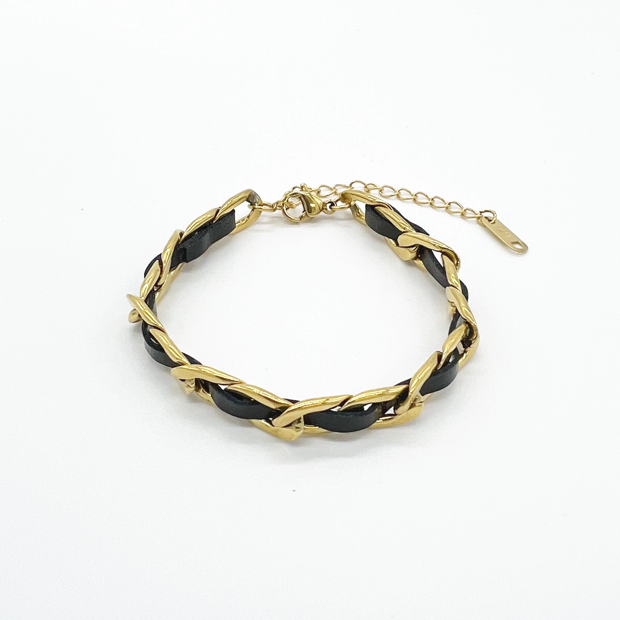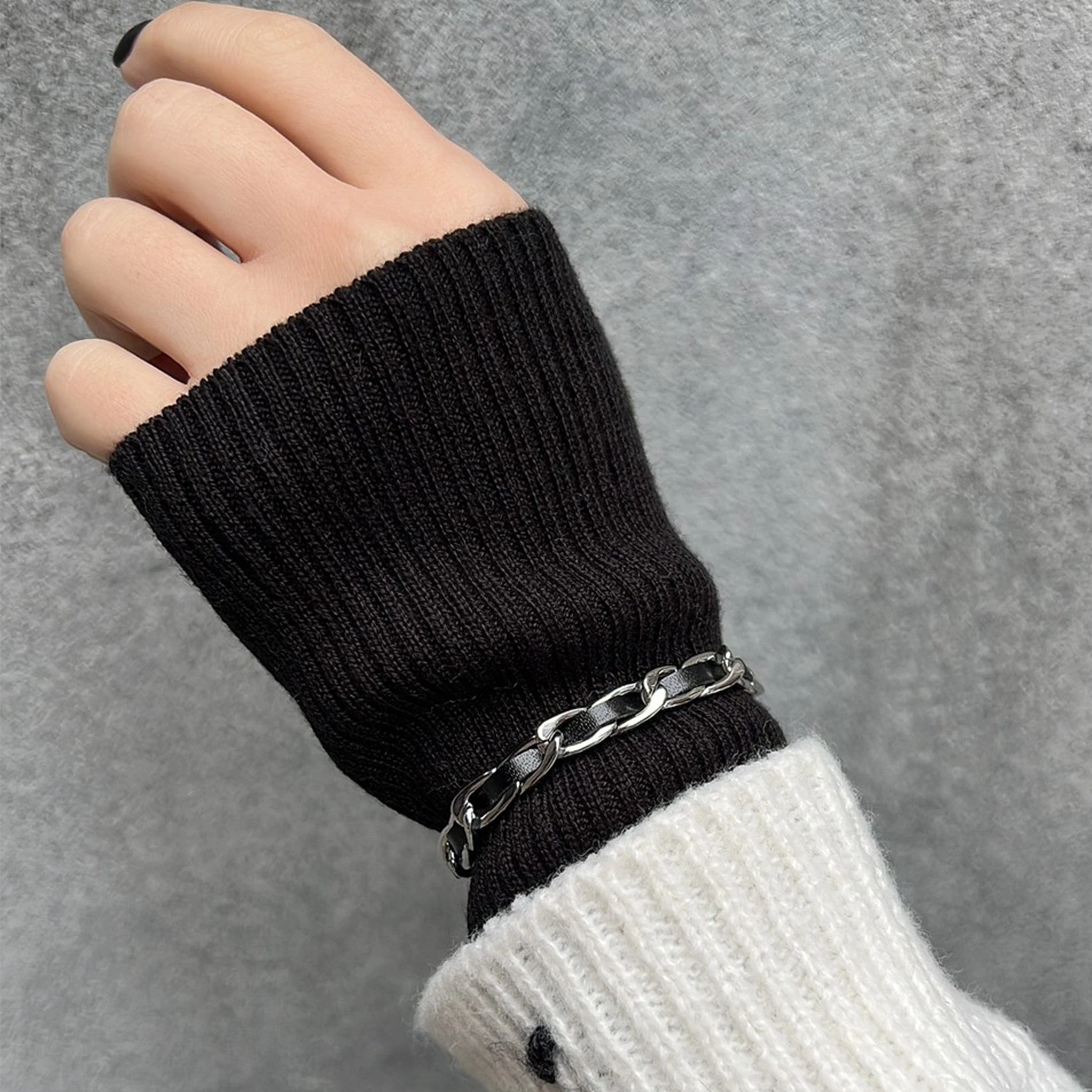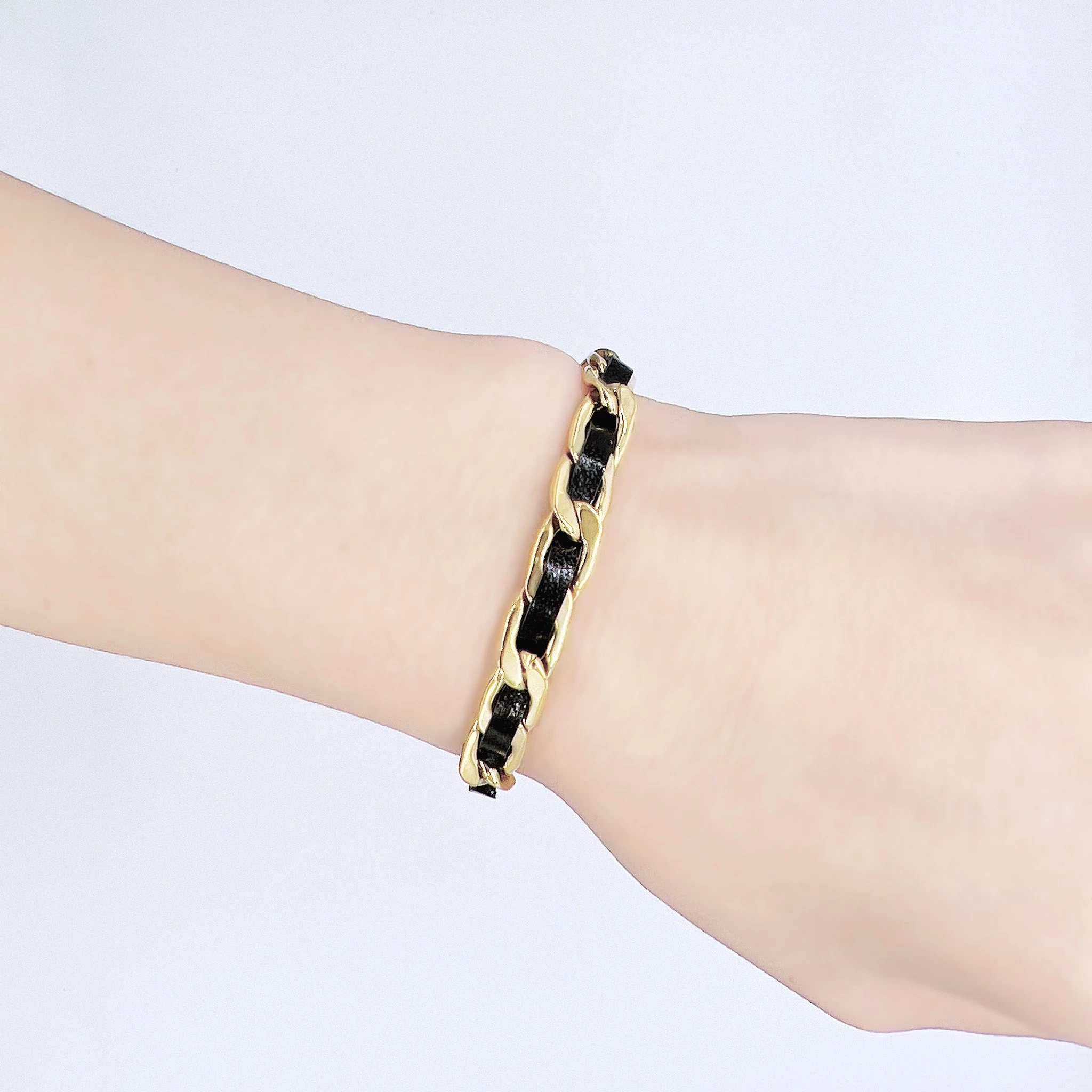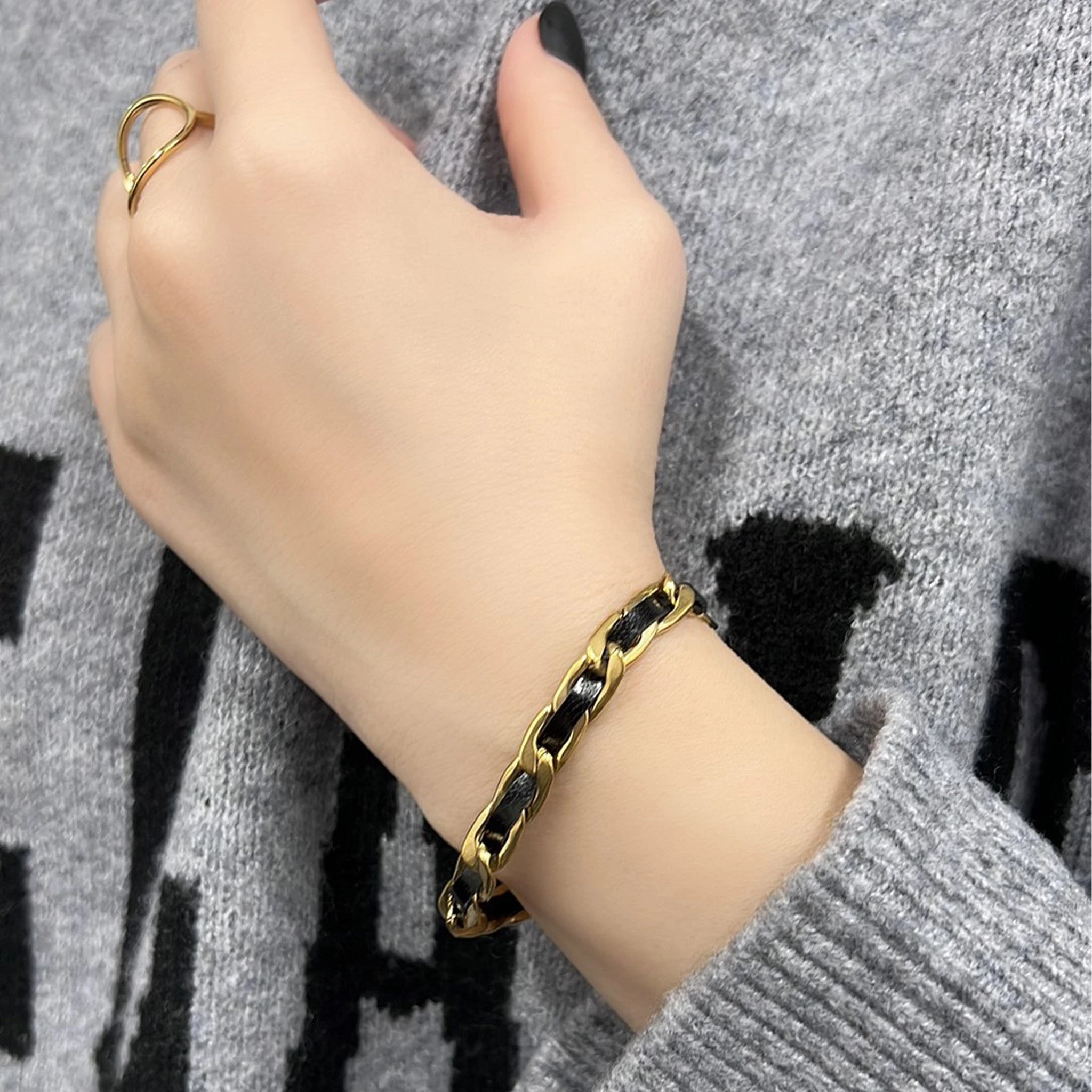 レザー×チェーンでクールな印象を与える「フェイクレザーチェーンブレスレット」。