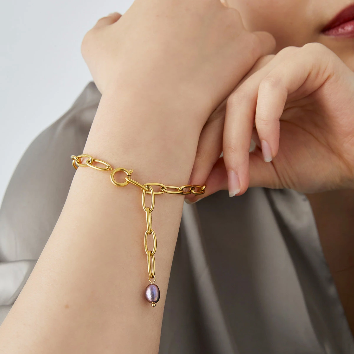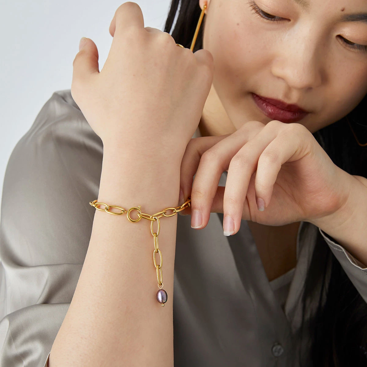 コーディネートのポイントに使えるクールな印象の「チェーンパールブレスレット」。