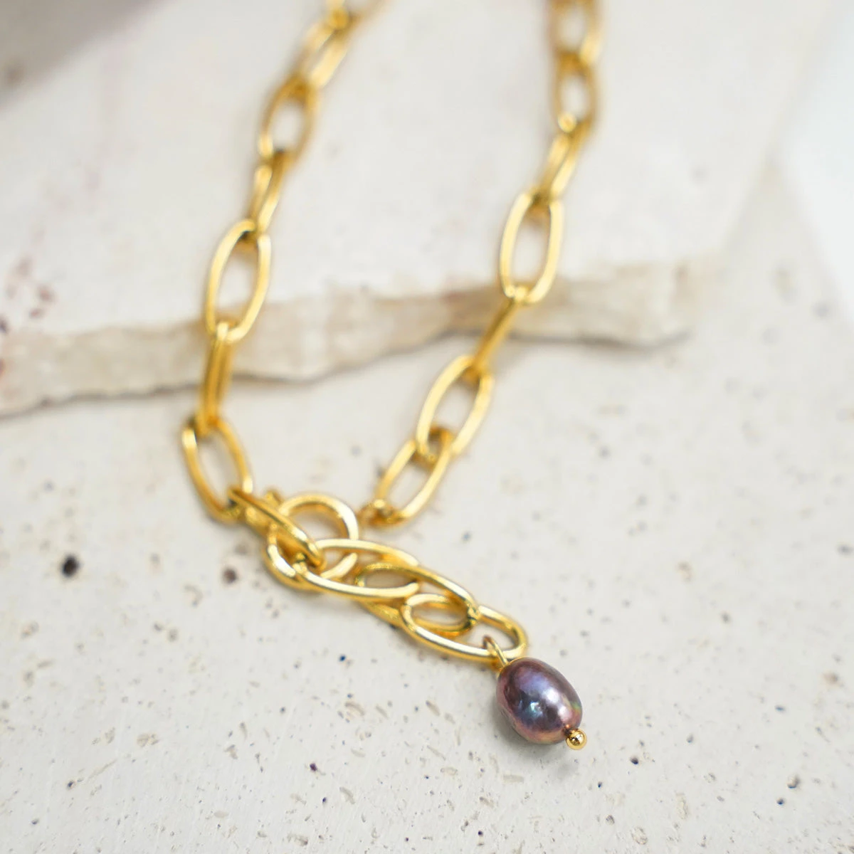 ブルー/パープルのような絶妙な色合いのパールと、ボリュームのあるチェーンが高級感を演出します。