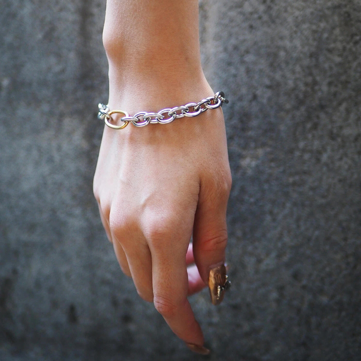 大ぶりのチェーンが手首を細く見せてくれます。