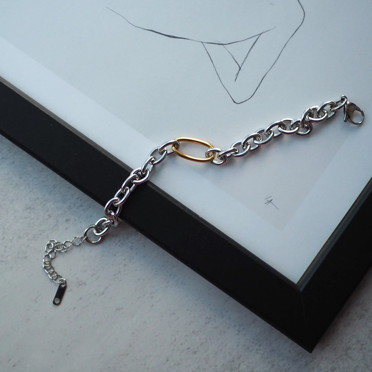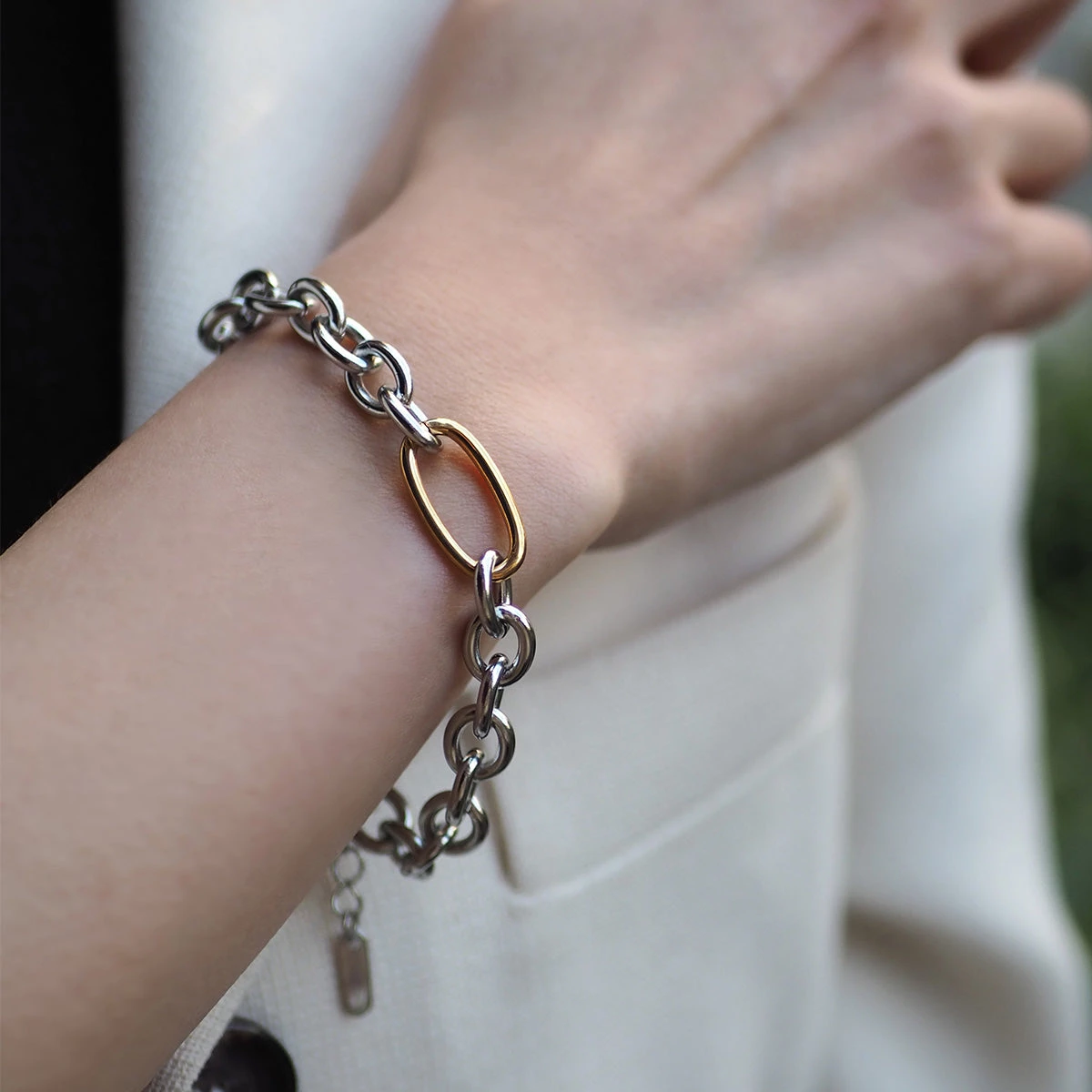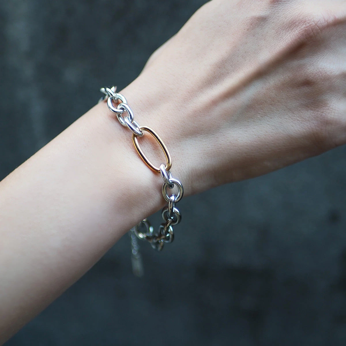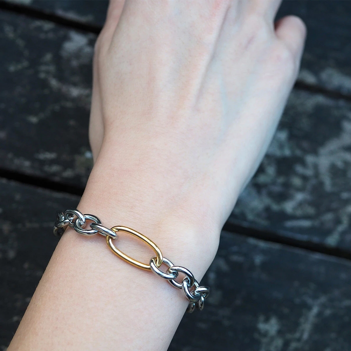 ゴールド×シルバーの組み合わせがおしゃれな「バイカラーチェーンブレスレット」。