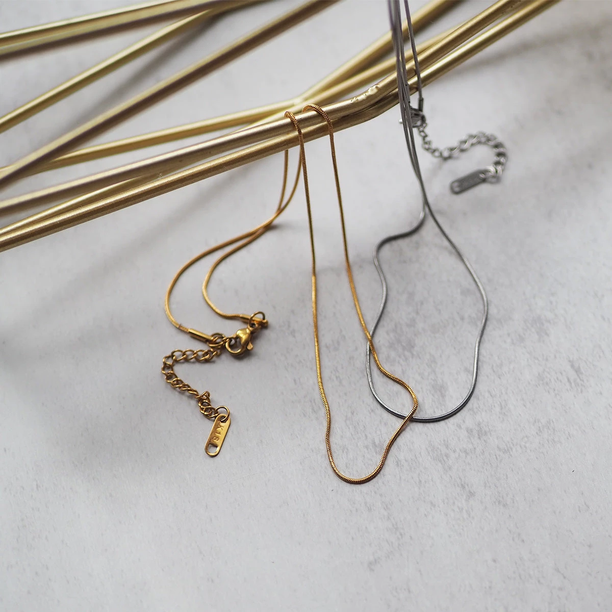 シンプルなデザインでタイムレスに着用できる「サージカルステンレス スネークチェーンネックレス」。