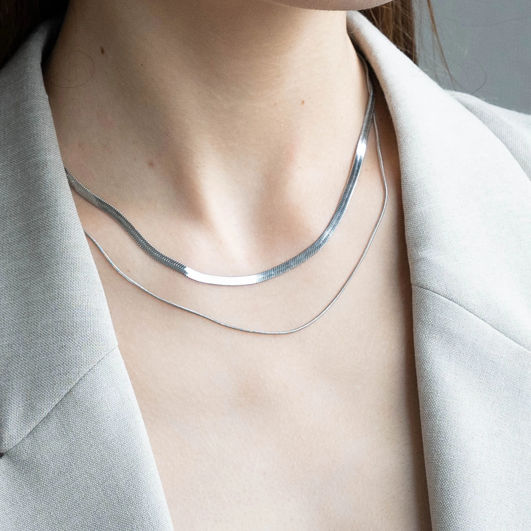 コーディネートにこなれ感をプラスできる「サージカルステンレス ダブルスネークチェーンネックレス」。