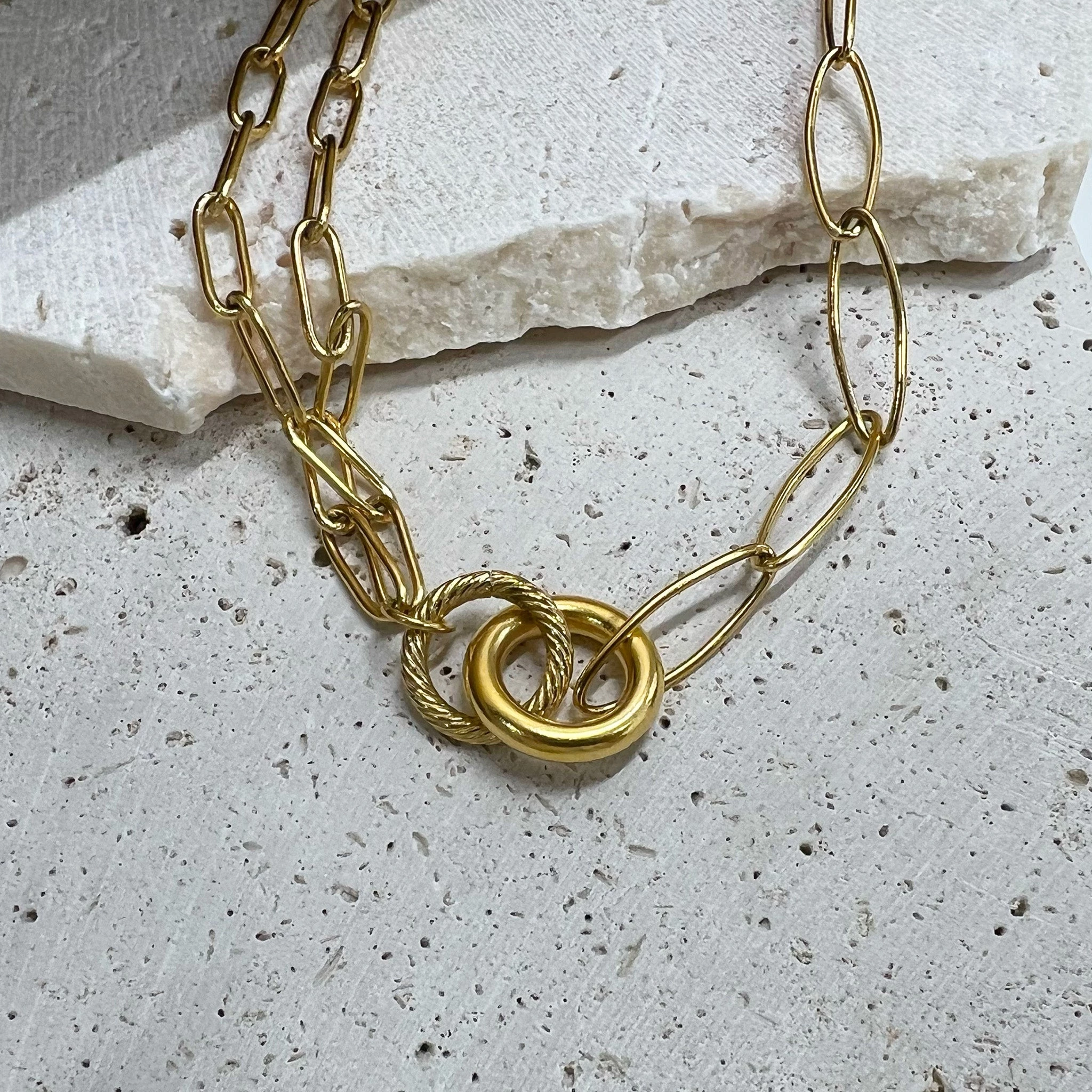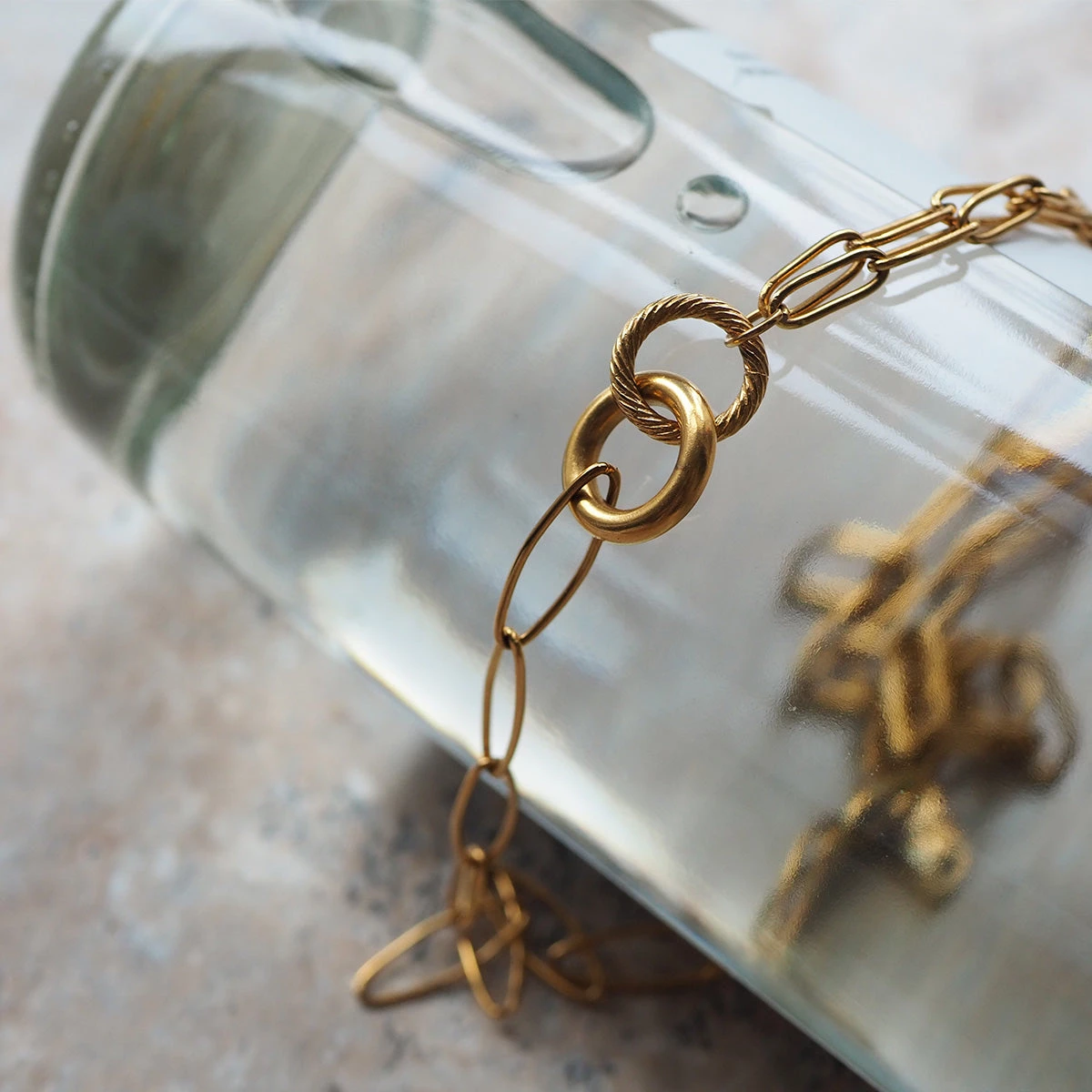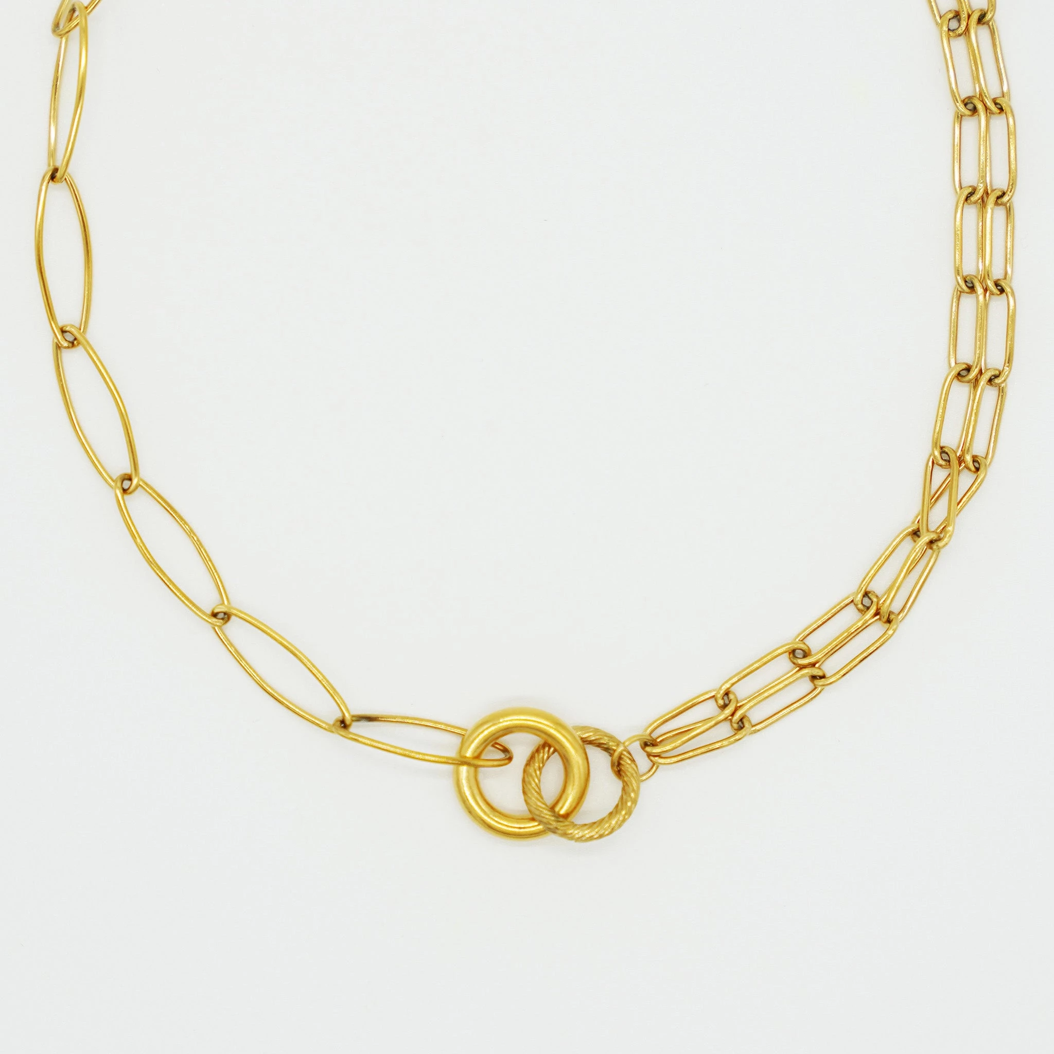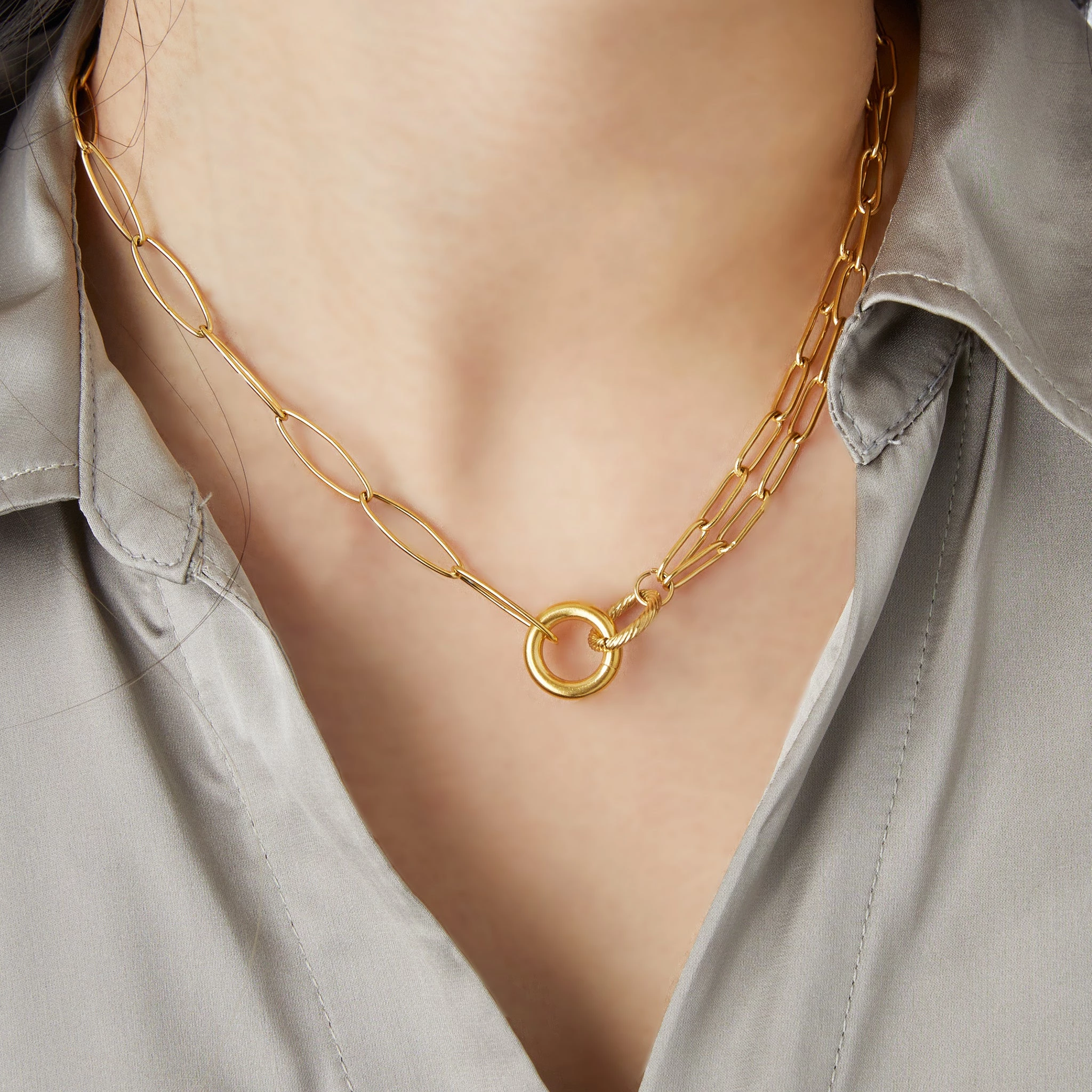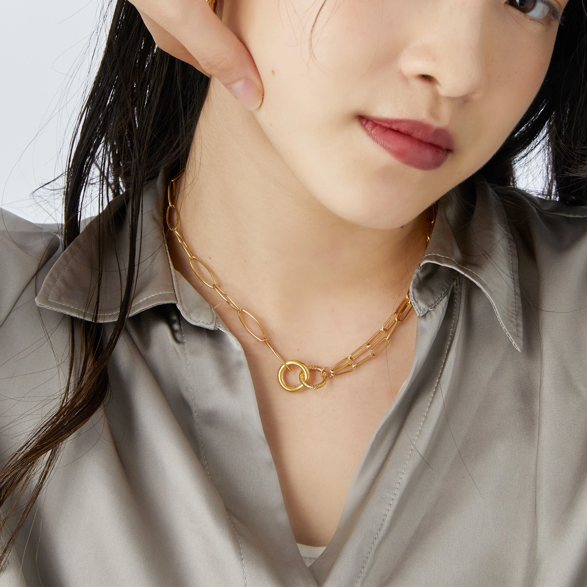 2つの異なるデザインのチェーンとリングが、コーディネートのアクセントになる「316L コンビチェーンネックレス」。