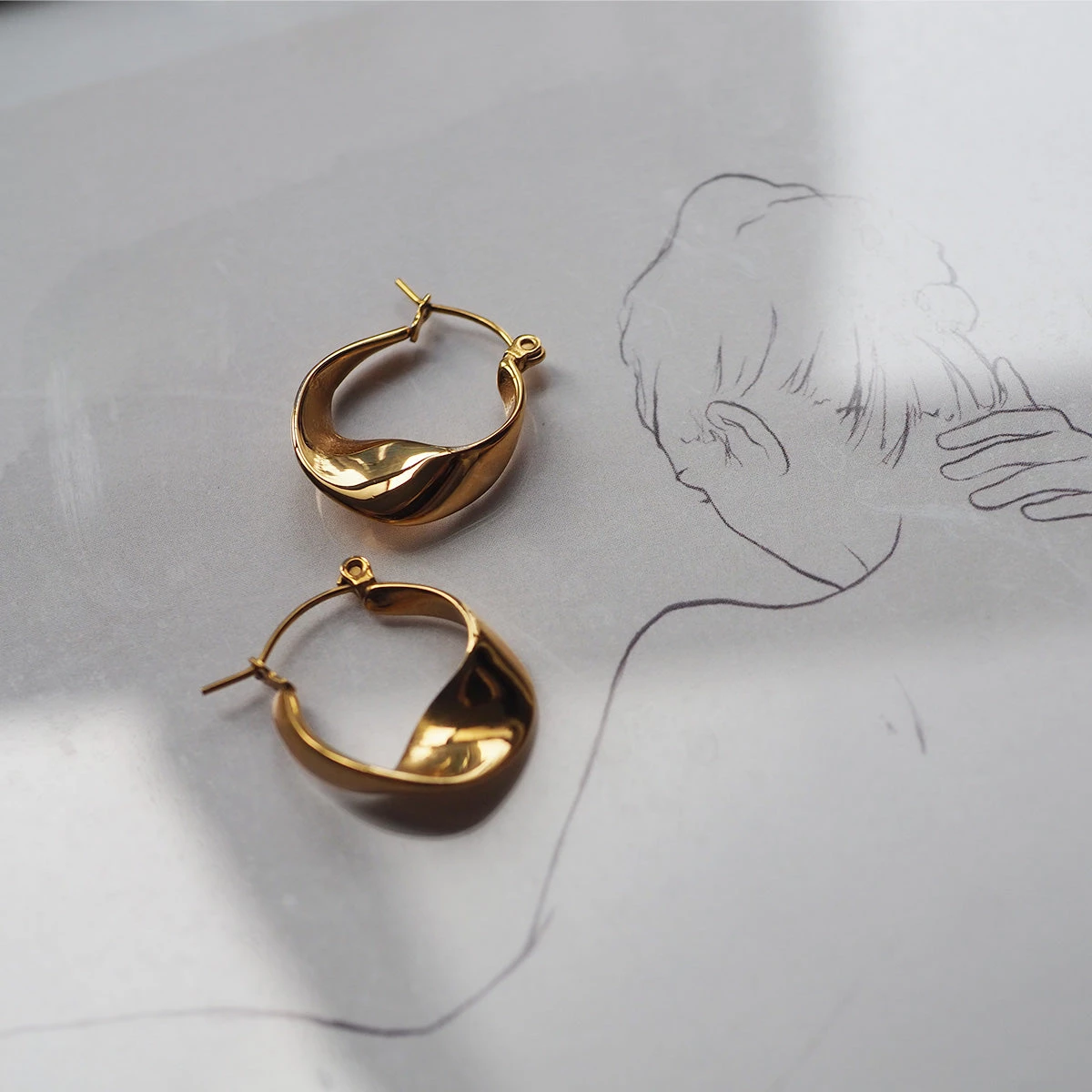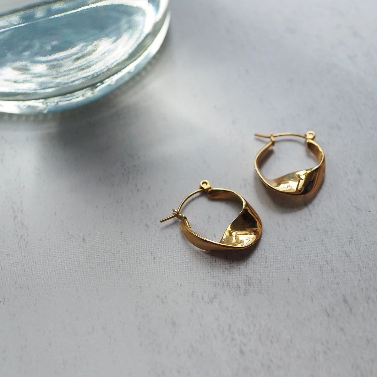 緩やかなねじりでニュアンスをつけたフープデザインの「ウェーブプレートピアス」。