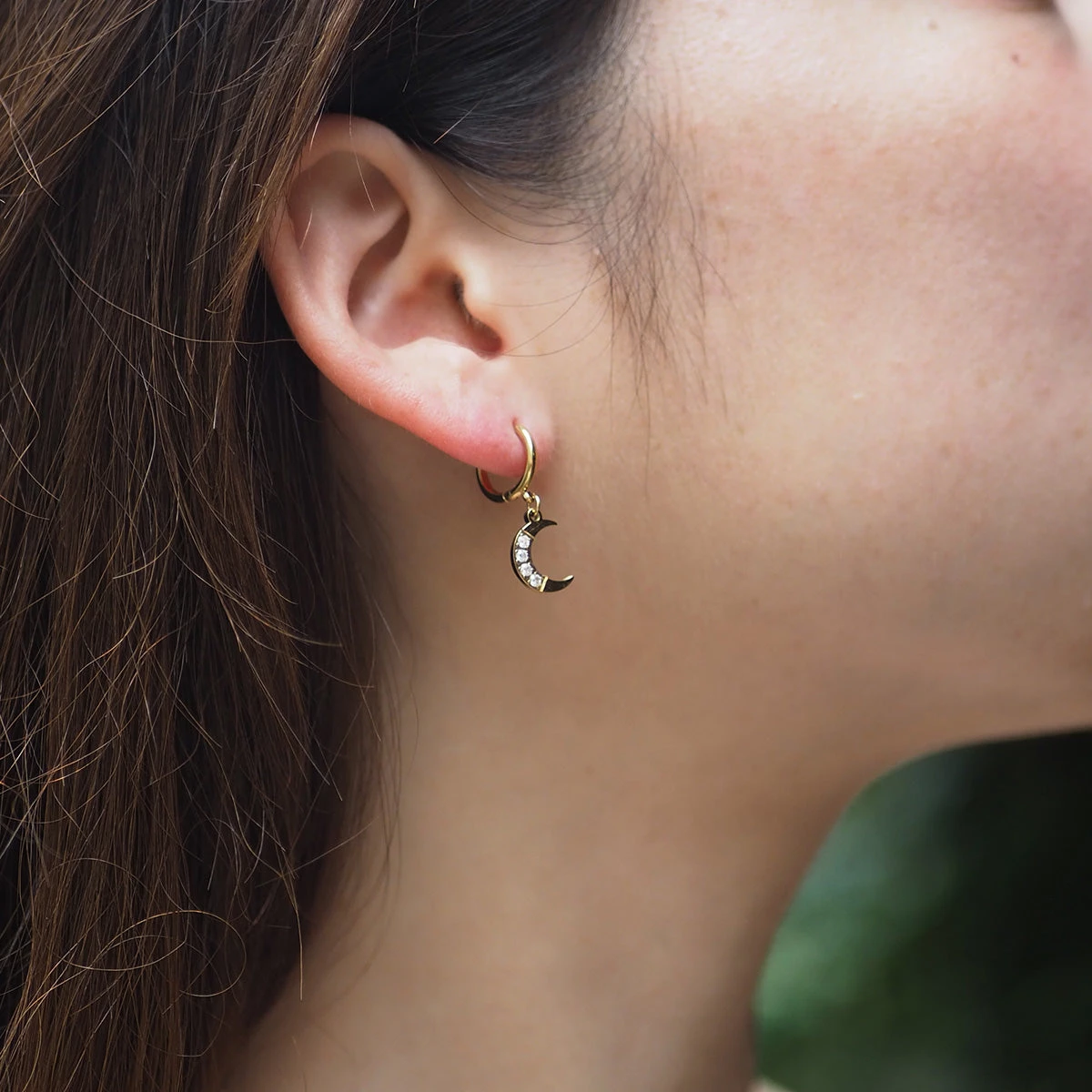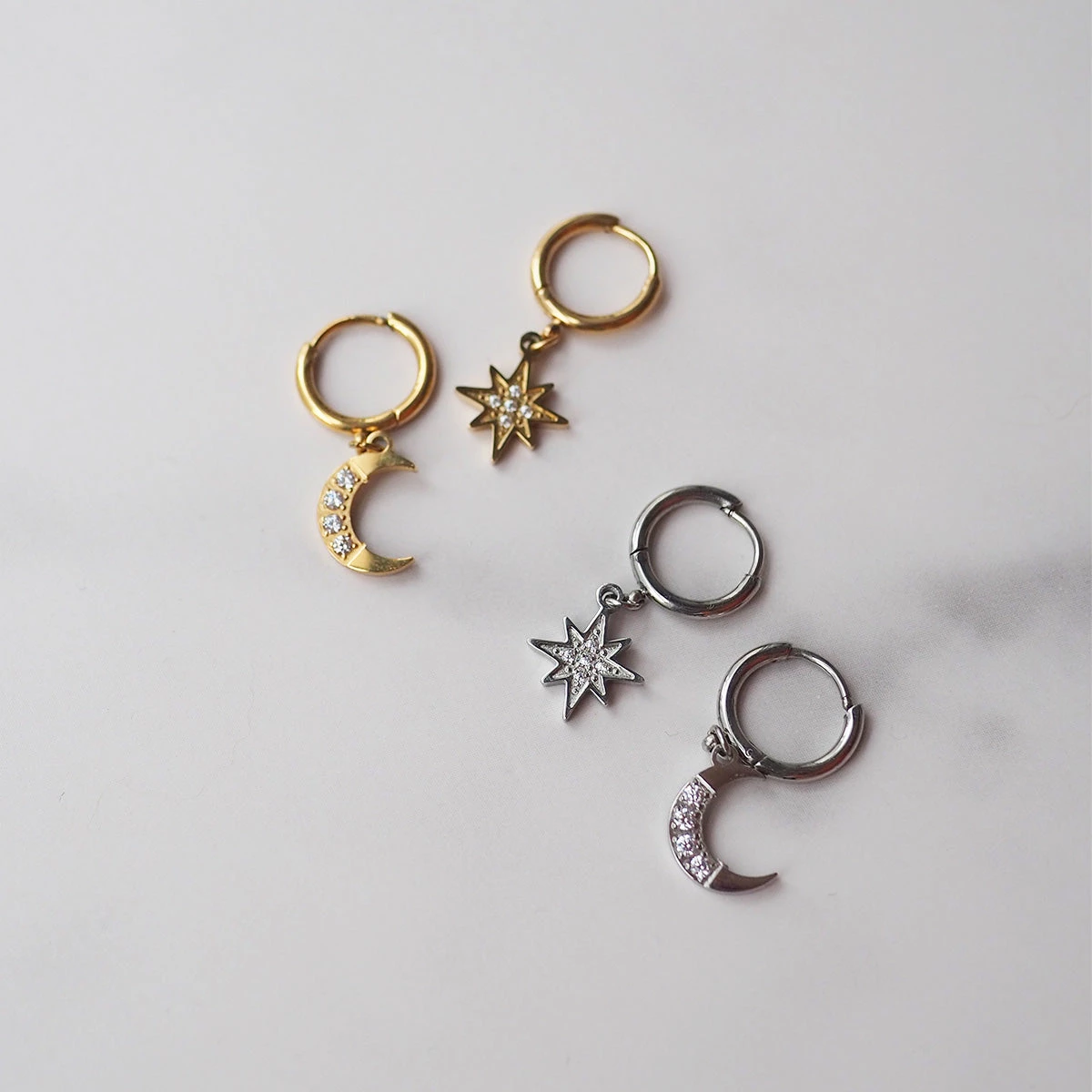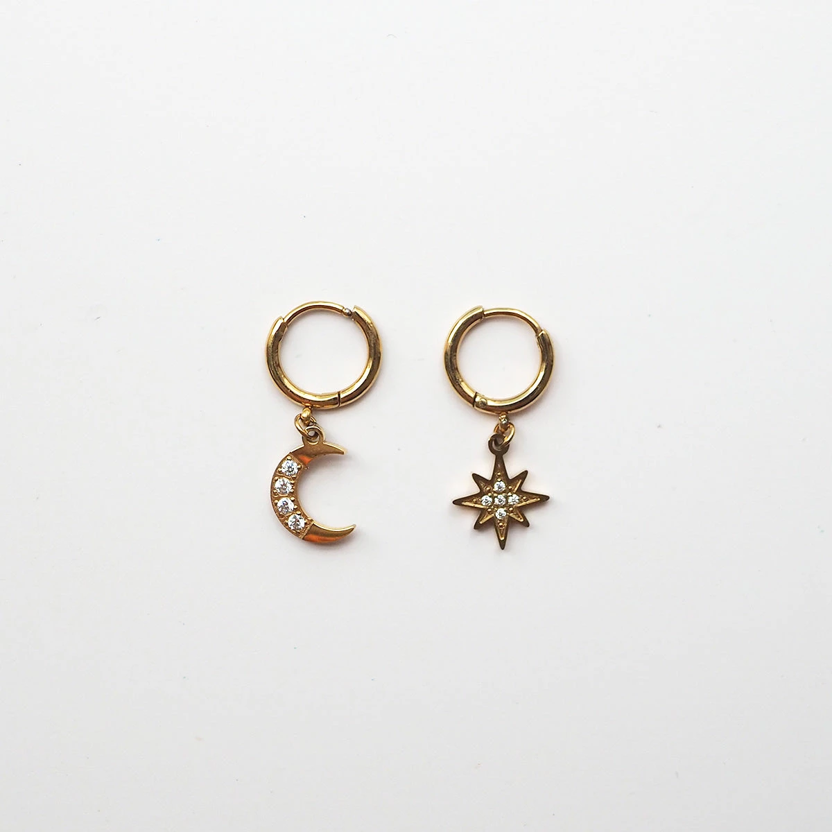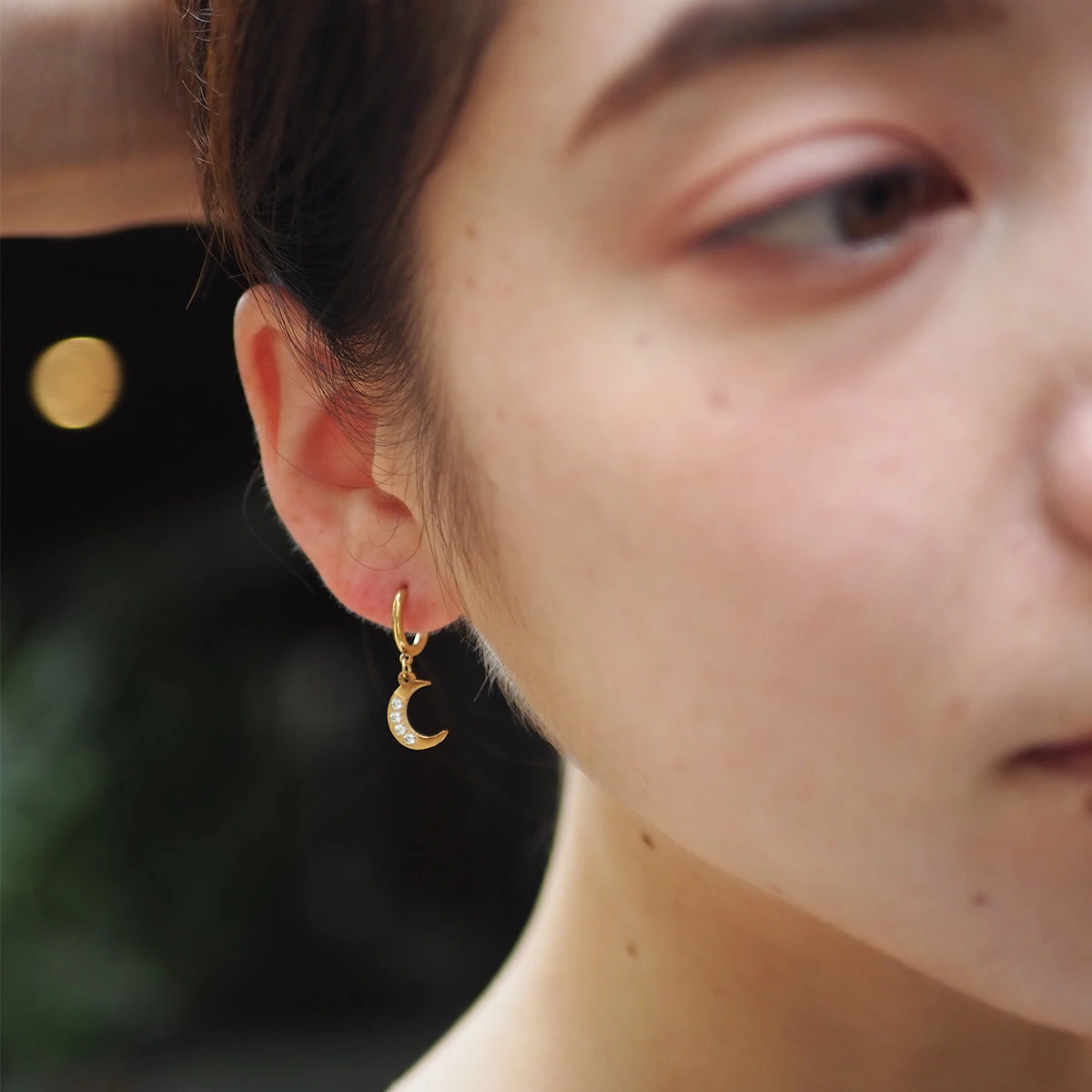 ミニサイズの月と星のモチーフにはジルコニアが散りばめられ、光にあたるたびに表情を変えるのが魅力的。
