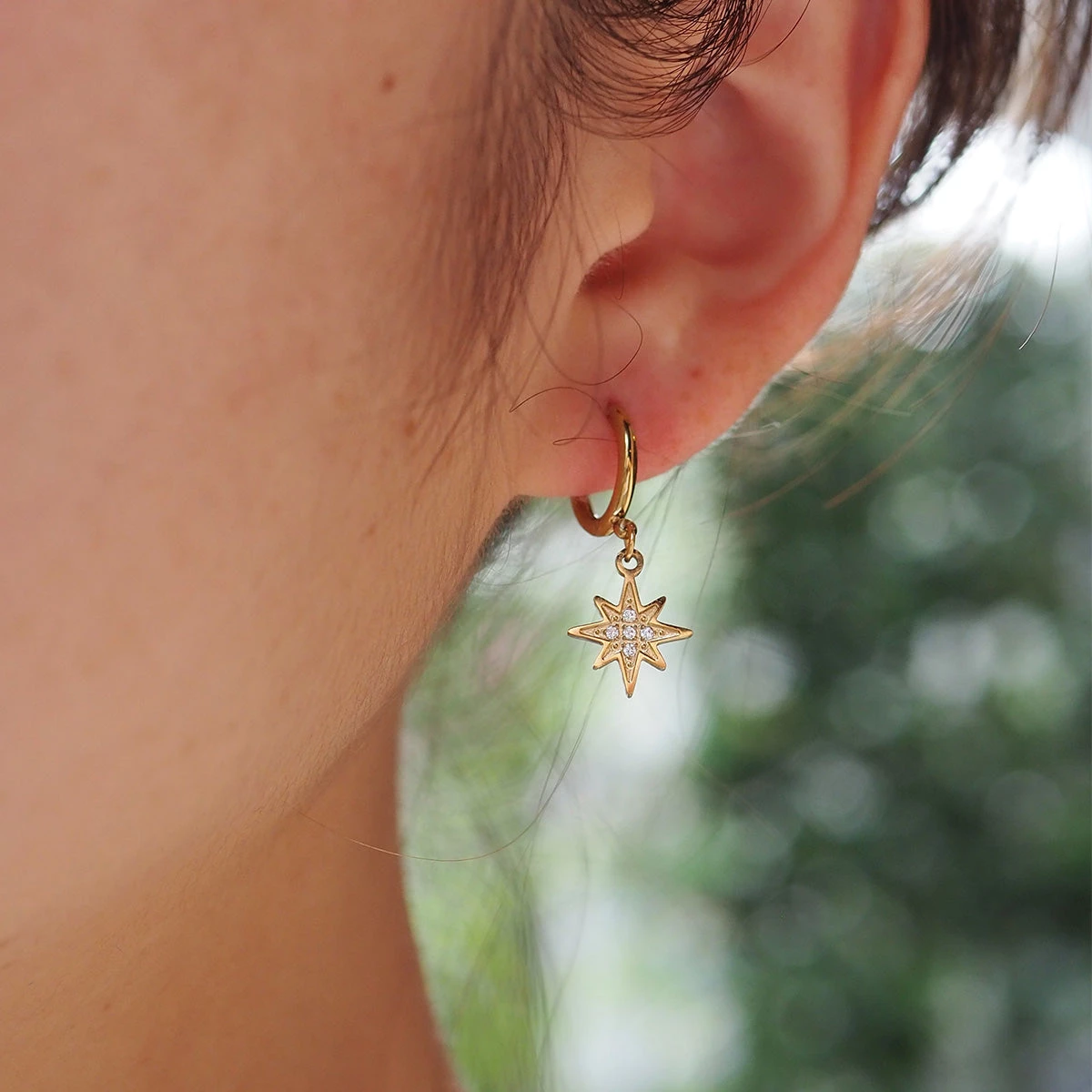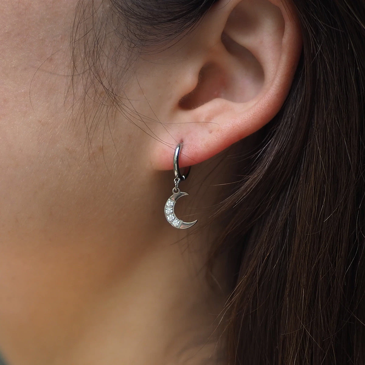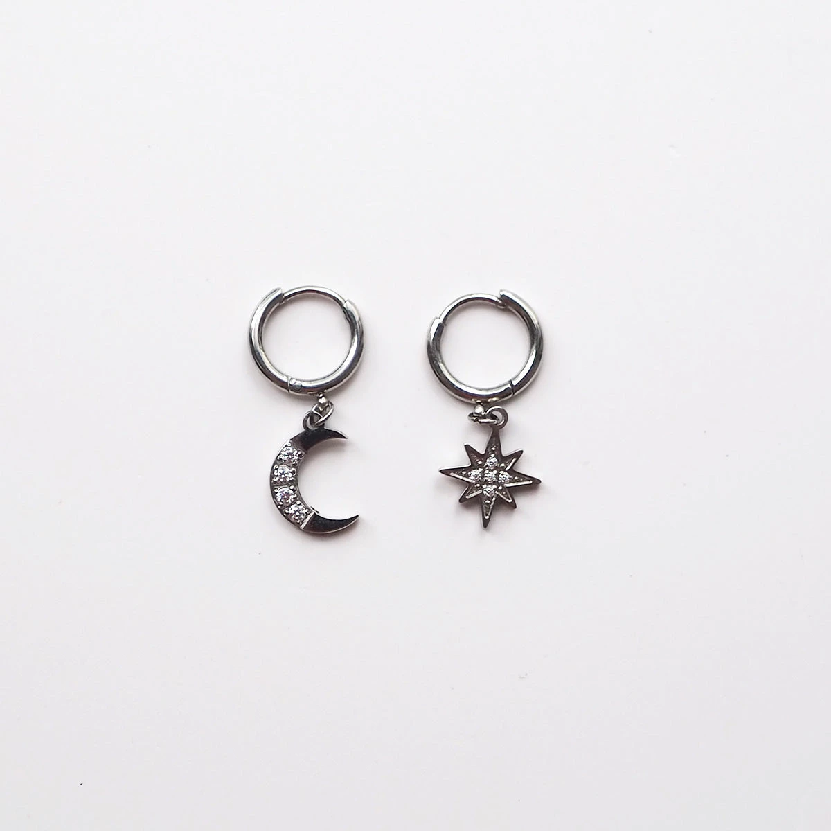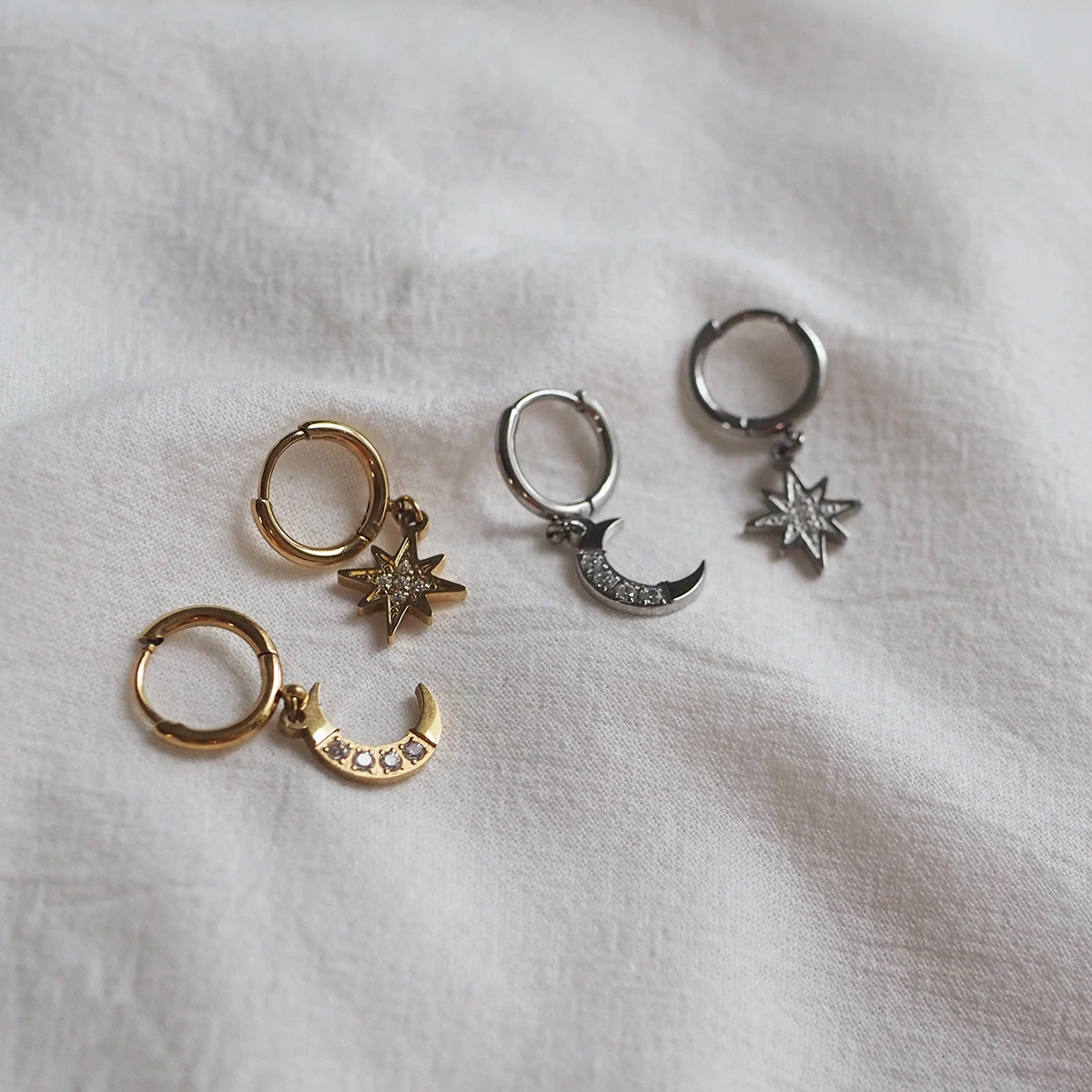 ミニサイズの月と星のモチーフにはジルコニアが散りばめられ、光にあたるたびに表情を変えるのが魅力的。