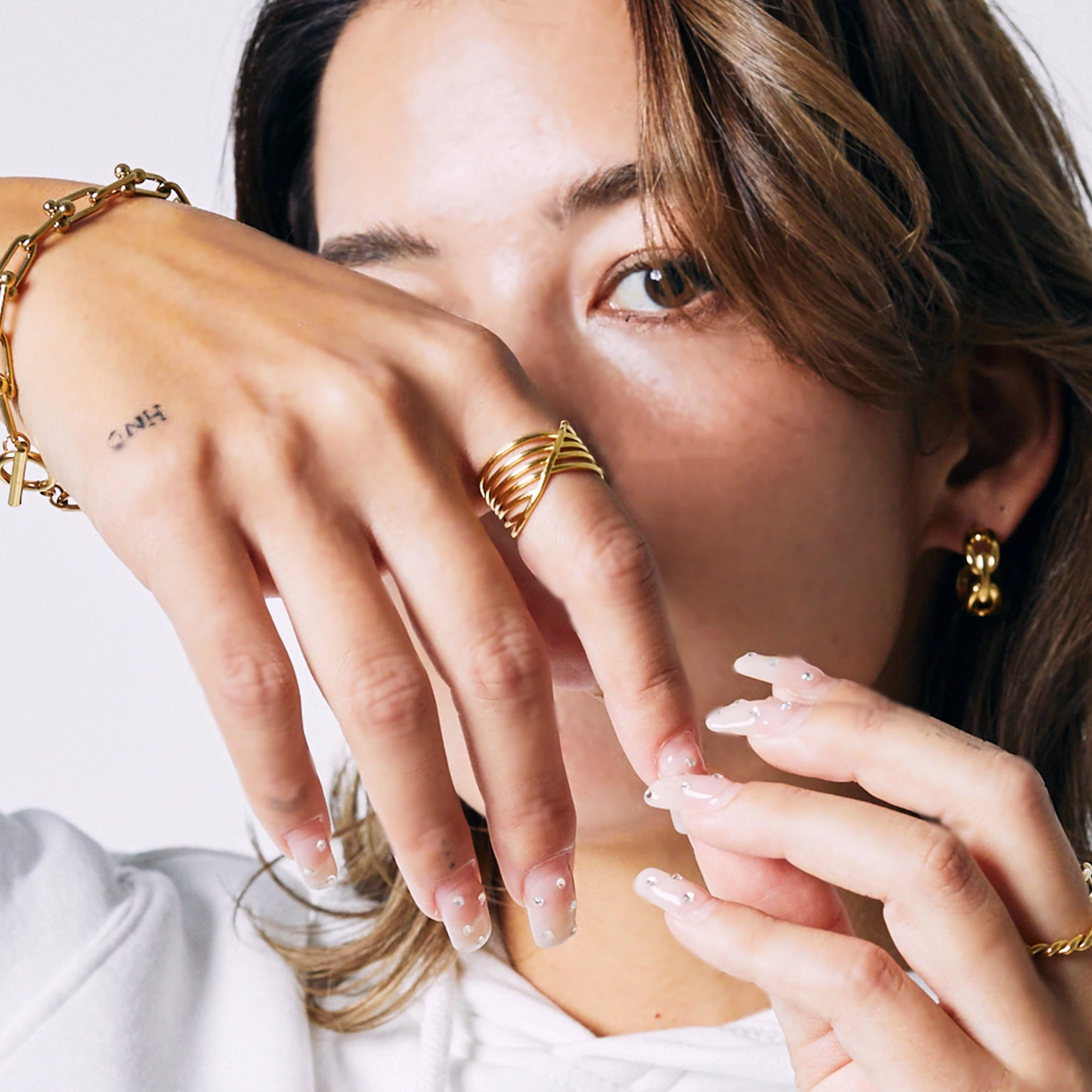 深めのゴールドカラーとレイヤーデザインがアクセントになり、一つ付けるだけでこなれた印象に。